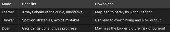 As engineers, we all wear different hats during our work. Sometimes we’re in learning mode, absorbing knowledge like a sponge. Other times, we’re deep in thought, pondering over the perfect solution to a complex problem. Then, there are moments where we’re in execution mode, getting things done efficiently. These are the three core operating modes we frequently shift between: Learner, Thinker, and Doer.